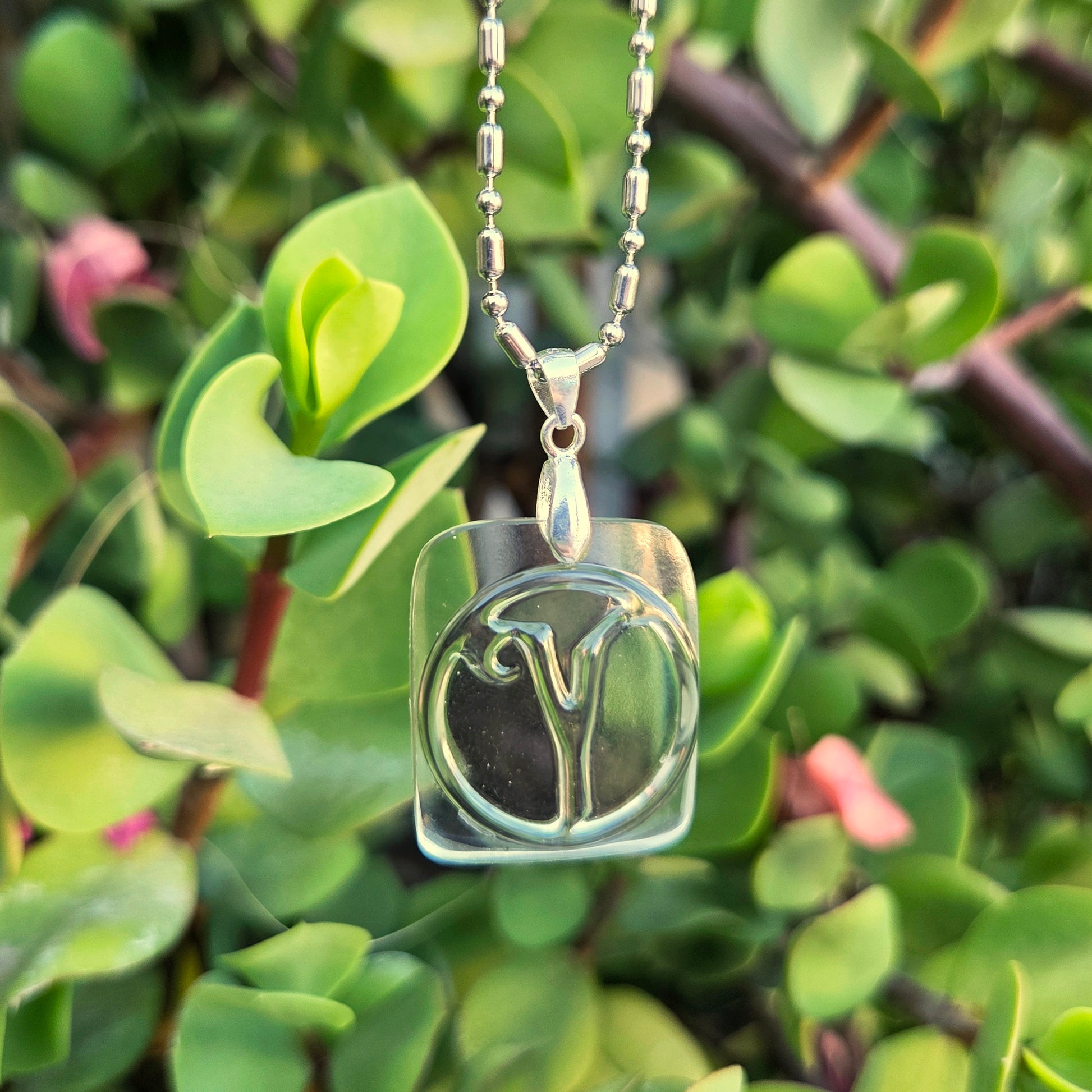 Made from a reclaimed whiskey bottle, this necklace is carefully cut and hand-finished for smooth, wearable edges and set in sterling silver. The original bottle was the letter Y, but this necklace can double for the Aires zodiac astrological sign!