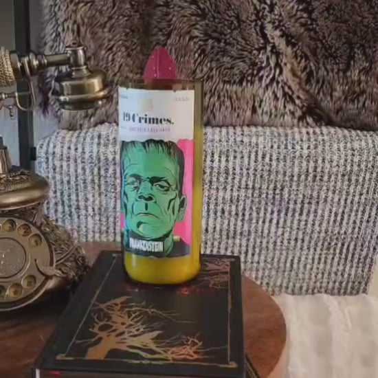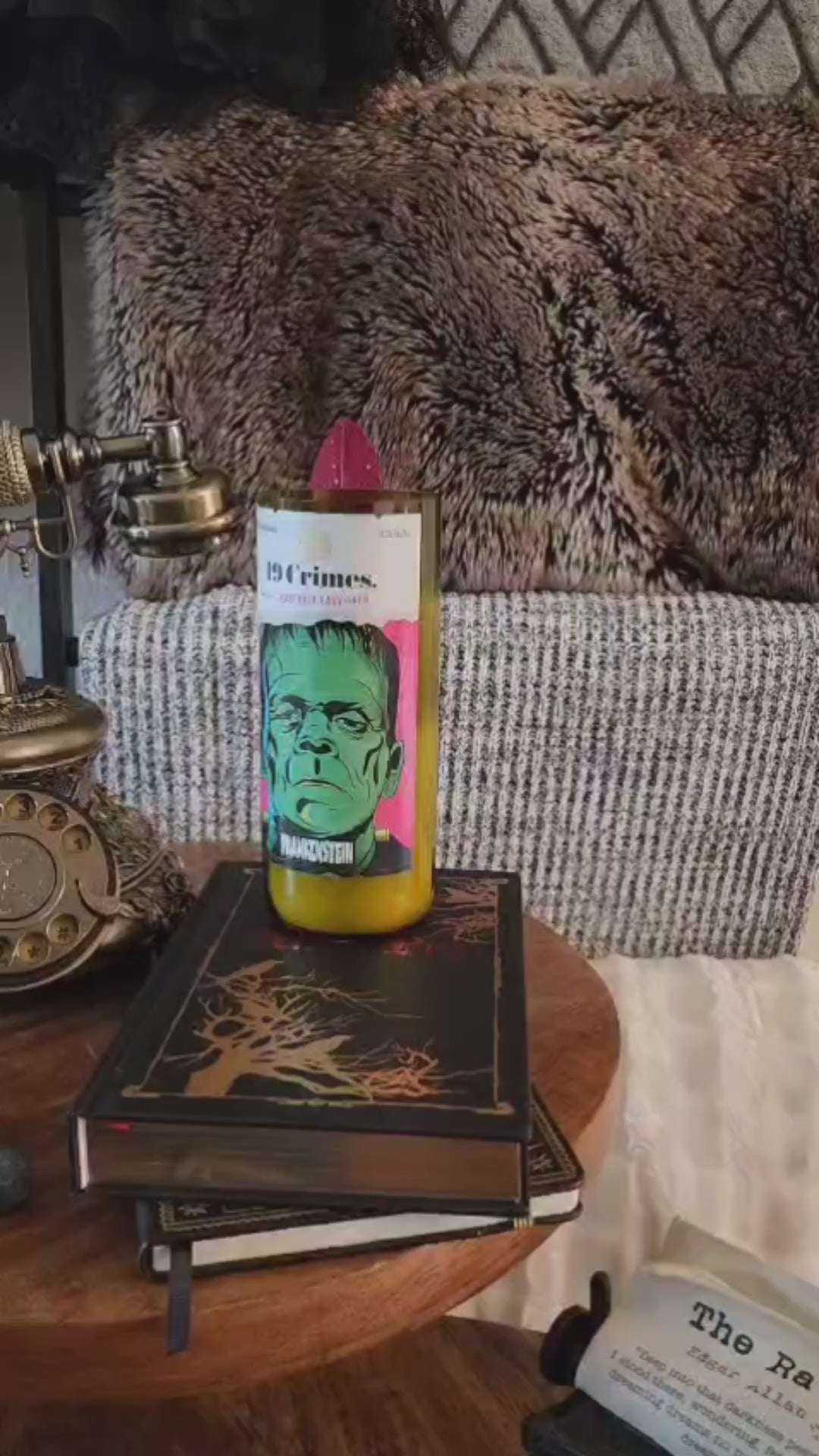 This wine bottle candle was handcrafted from a recycled bottle. Cactus Vine Candles is not affiliated with 19 Crimes, or Frankenstein—just bringing a little monster magic to your space.
