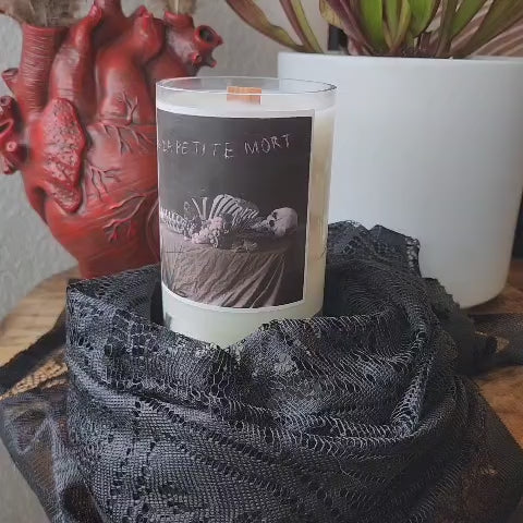 Light up the night with a touch of dark elegance—this Halloween wine bottle candle is hand-poured into a 15oz recycled bottle featuring the hauntingly chic “La Petite Mort” skeleton label. Infused with our Caramel Apple scent, it blends crisp orchard apples and buttery caramel for a cozy fall aroma that’s equal parts sweet and spooky. Perfect for gothic décor, seasonal ambiance, or as a one-of-a-kind Halloween gift.