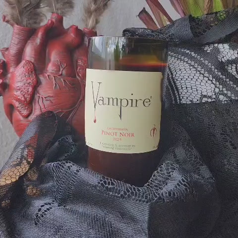 Sink your teeth into the season with this 16oz Vampire wine bottle candle, hand-poured into a recycled bottle featuring a charred-edge label that looks freshly plucked from the crypt. The wax itself is a deep, blood-red hueâperfectly suited for the rich, intoxicating aroma of our Full Bodied scent, a blend of dark cherry, vanilla, and oak. Elegant yet eerie, itâs a candle that brings gothic romance and haunting sophistication to your space.